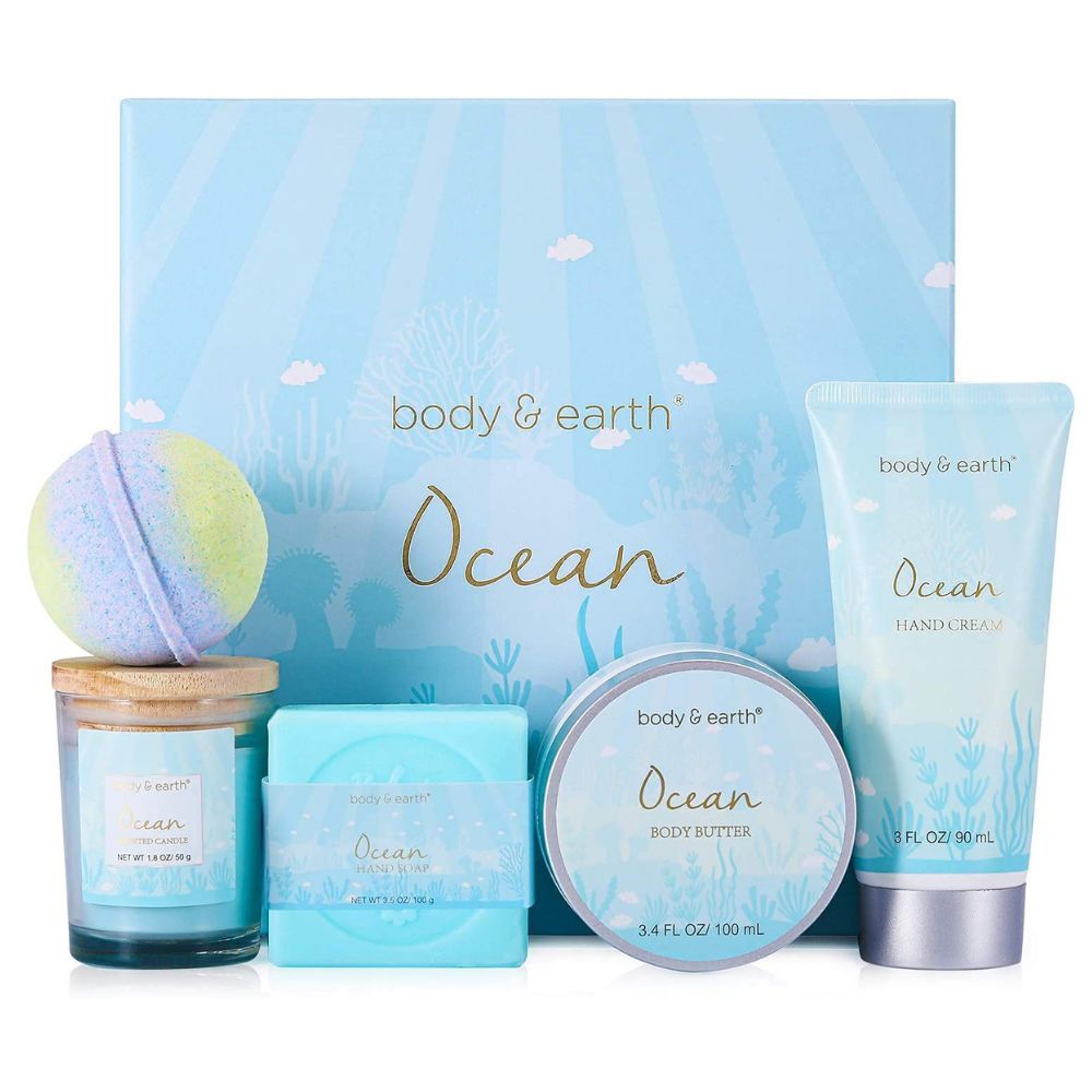 Juego de regalo de spa de baño impregnado con un relajante aroma a océano que le gusta. Estos productos están destinados a ponerla en un estado de relajación y felicidad como si estuviera en la playa. Impregnado con aceites esenciales que se mezclan para crear el aroma perfecto del océano.