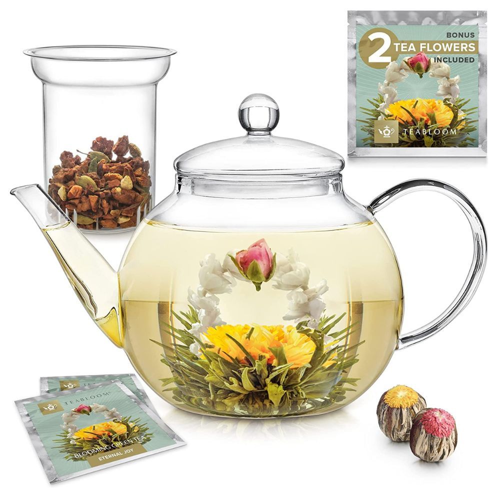 ¿Pero tiene ella una tetera de vidrio de calidad superior, con dos flores de té florecientes con infusión de jazmín y perfecto también para té de hojas sueltas, bolsas de té y aguas con infusión de frutas?