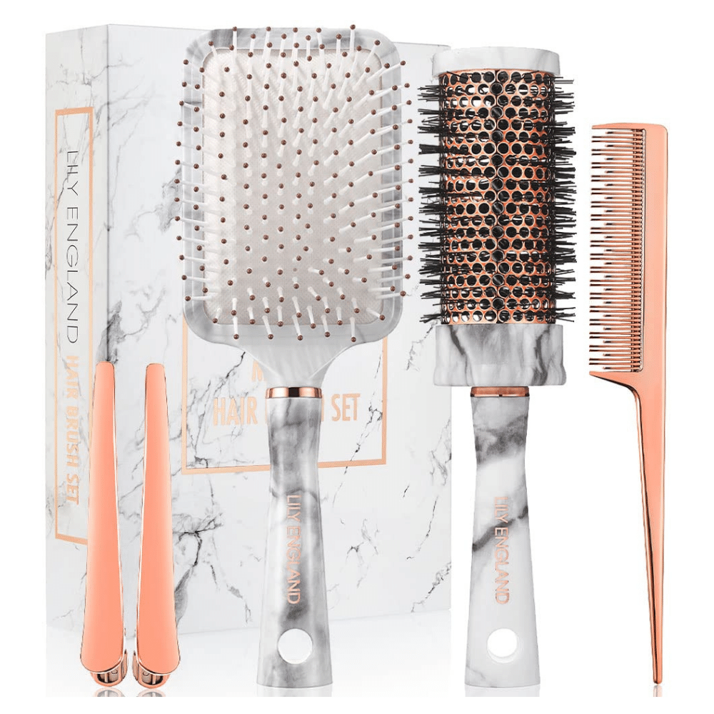 Toda mujer necesita hermosas herramientas para el cabello, y este juego de 5 piezas viene en un elegante diseño de mármol y oro rosa para todo tipo de cabello.