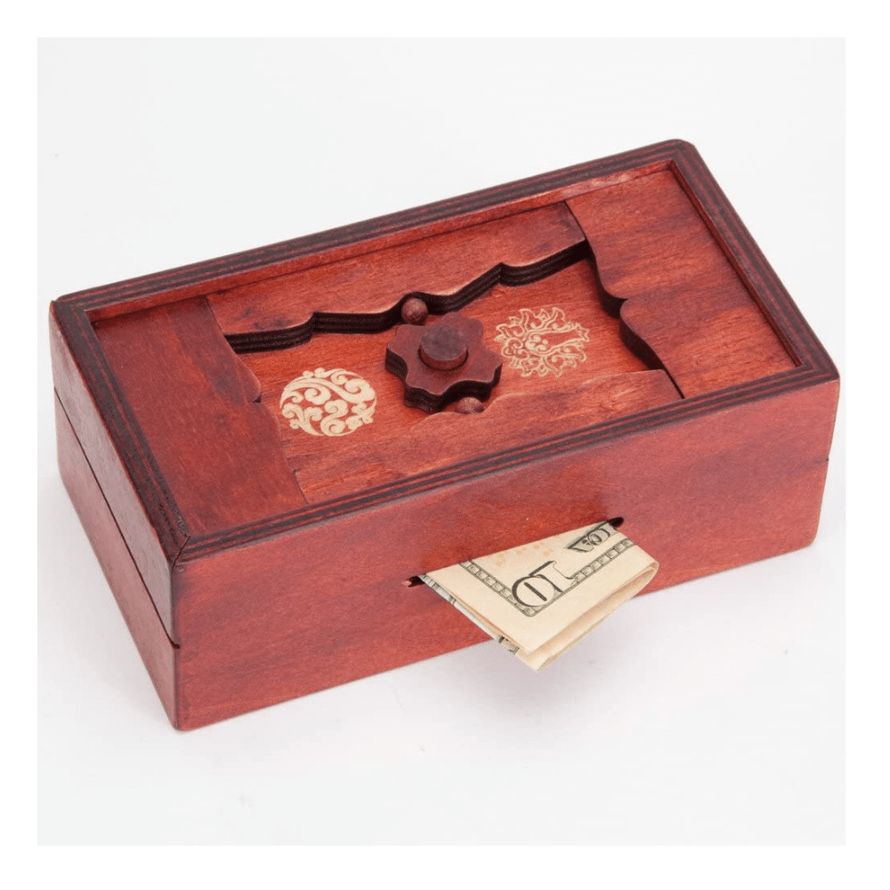 Caja de rompecabezas japonesa Bits and Pieces, ocultará y protegerá tus ahorros. Desliza tu tesoro a través de las dos ranuras en los lados de esta caja inteligente, y luego disfruta viendo los intentos de resolver esta divertida pero desafiante caja de rompecabezas.