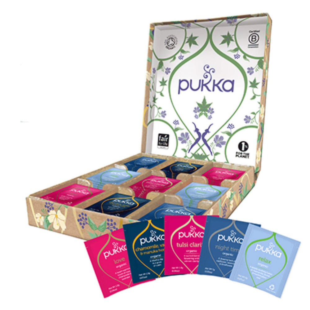 45 bolsas de increíbles tés de hierbas orgánicas seleccionados de la gama Pukka para darte un momento tranquilo. Claridad Tulsí, Para la noche, Amor, Relajación, Manzanilla con vainilla y miel de Manuka.