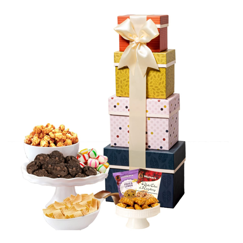 Torre de regalo gourmet. Bellamente empaquetada, esta cesta de regalo es perfecta para felicitaciones, agradecimiento, cumpleaños, jubilación o compromiso.