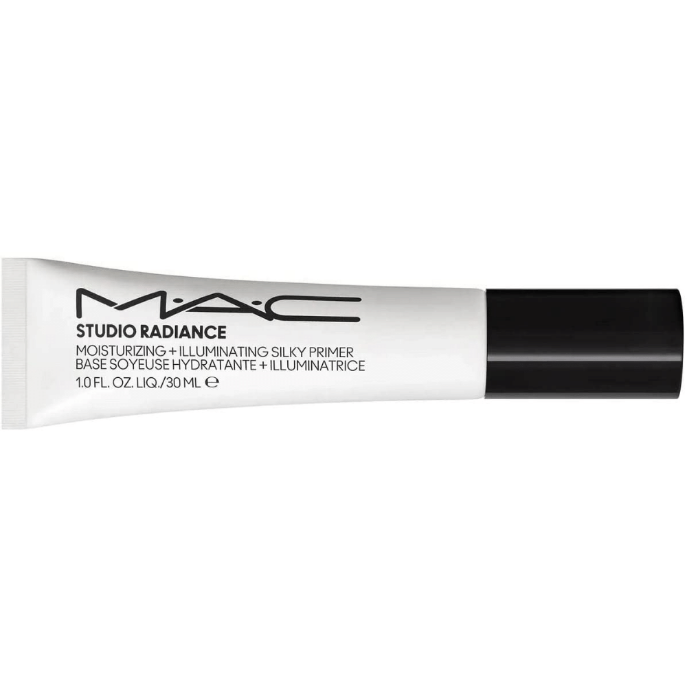 Para lograr una piel radiante y brillante, prepara tu piel con una prebase que aumente la luminosidad, como esta fórmula iluminadora Studio Radiance de Mac.