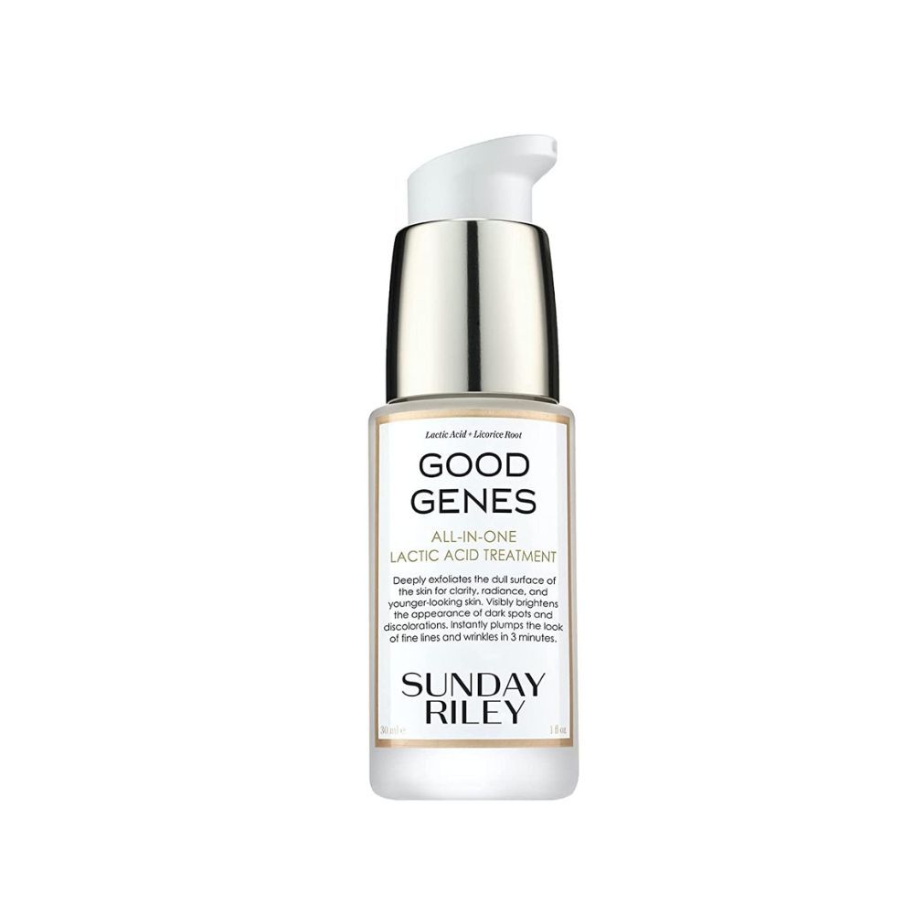 El tratamiento con ácido láctico Good Genes de Sunday Riley es una fórmula multi-beneficio que exfolia suavemente la piel para revelar un brillo y luminosidad instantáneos.