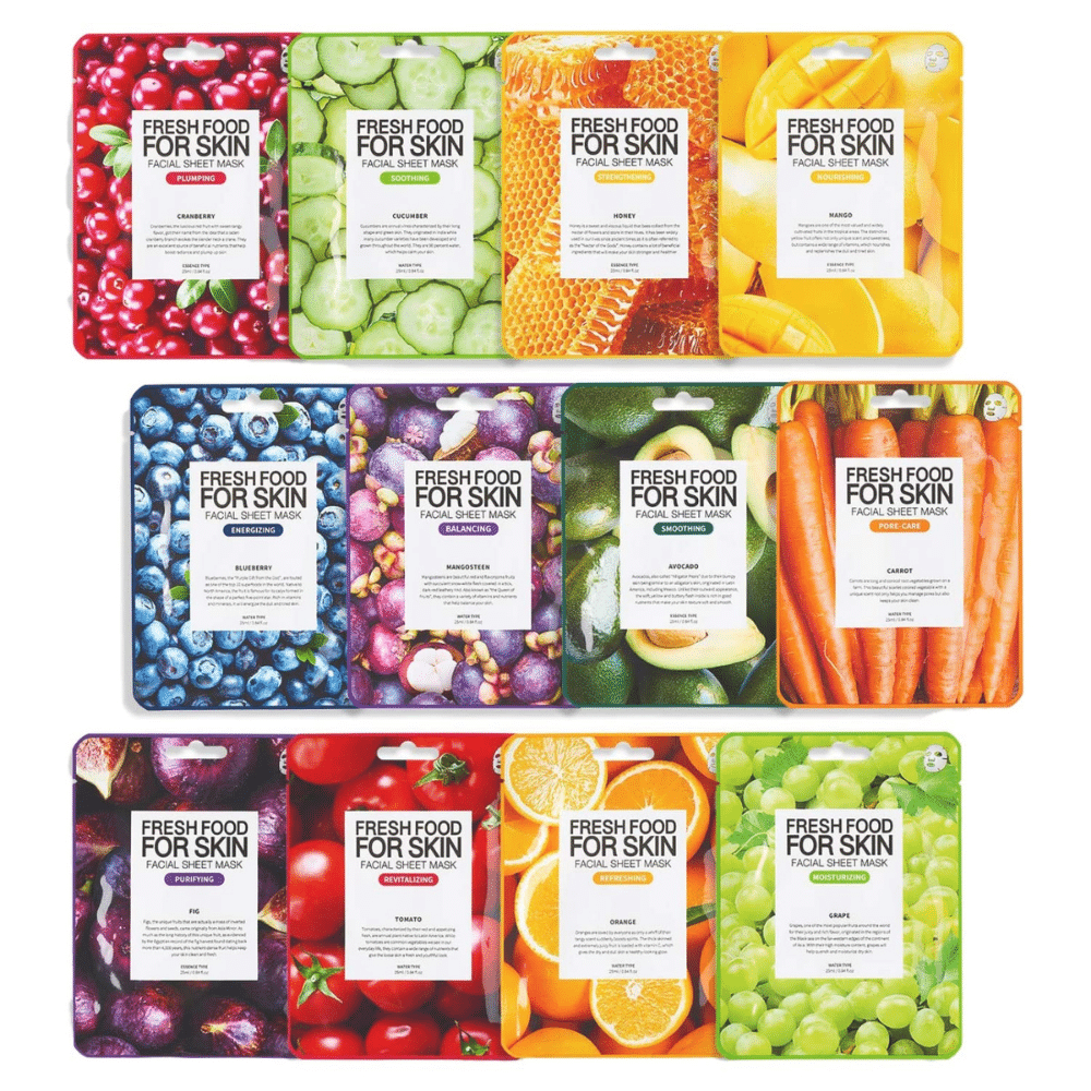 Paquete de 12 combos: aguacate, pepino, uva, naranja, higo, tomate, mango, arándano, miel, mango, arándano, zanahoria de FARMSKIN