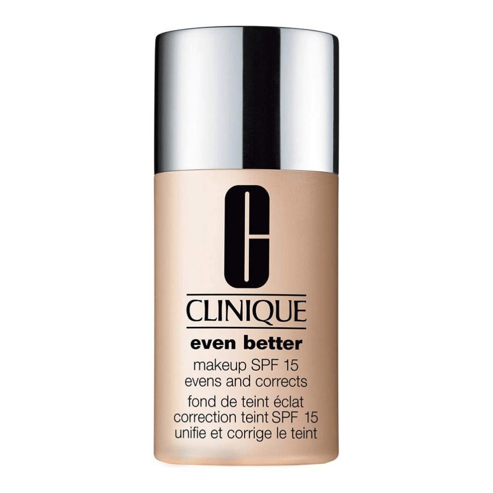El maquillaje Even Better de Clinique viene en 50 tonos y tiene una fórmula desarrollada por dermatólogos, con vitamina C, que unifica el tono, para proporcionar una cobertura media con manchas de la edad visiblemente disminuidas, extractos botánicos y glicerina ayudan con un tono de piel uniforme para una tez más juvenil con protección SPF 15.