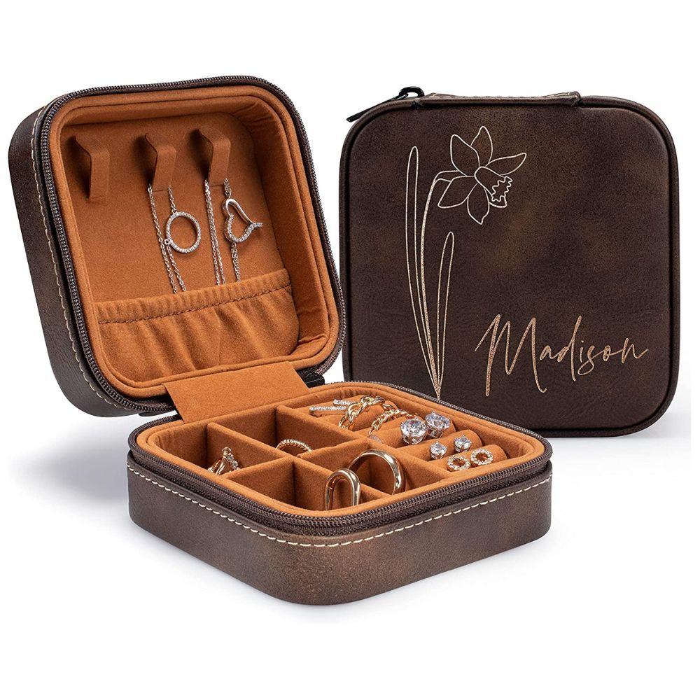 ¡Haz un regalo único para esa persona especial con este joyero personalizado! Personaliza el mes de la flor de nacimiento junto con el nombre del destinatario, y haz que sea un regalo personalizado para su cumpleaños o como regalo de aniversario.